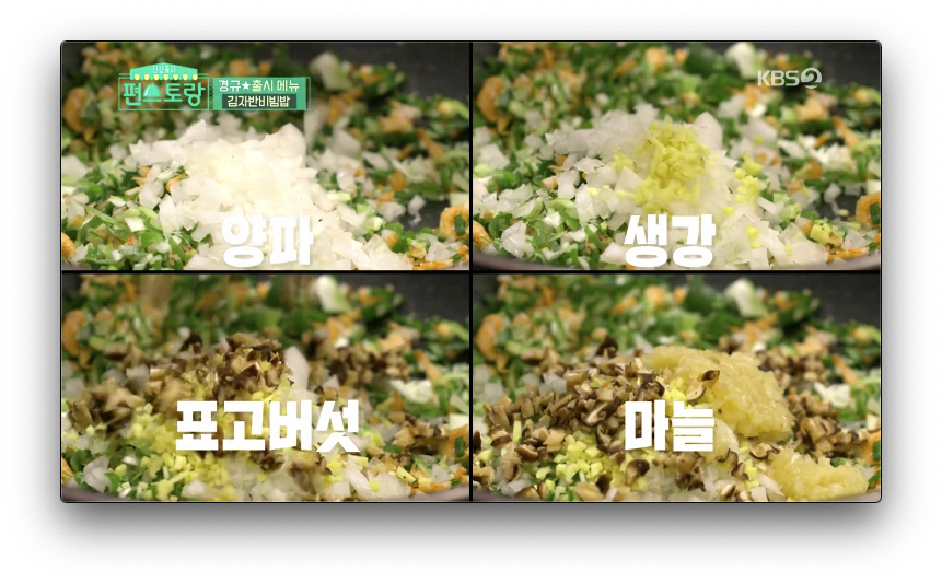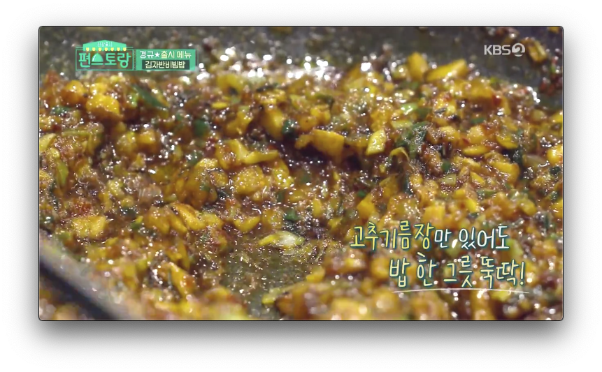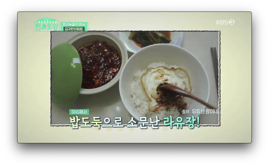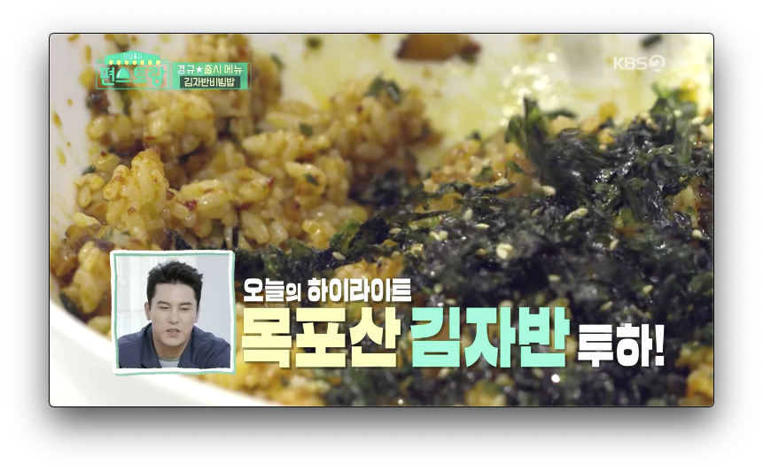 편스토랑에서 이경규님이 목포 김을 이용한 김자반 비빔밥이 소개되었습니다. 집에서 김자반을 이용해서 간단하게 밥하고 양념을 한뒤 주먹밥을 만들어 먹기도 하는데요 이번에 소개되는 김자반 비빔밥은 밥에 라유장과 고추장을 이용해서 고추기름장을 만들었고 고추기름장을 가지고 비빔밥을 만든뒤 김자반을 넣어서 김자반비빔밥을 만드는데요 양념장과 조리과정이 자세하게 알려주고 있어 집에서 쉽게 따라할수 있고 집에서 만들때 기호에 맞게 추가해서 넣을수 있어서 이번 요리는 계속해서 사용될거 같습니다 그리고 들어가는 라유장은 중식 요리에 빠질 수 없는 양념이기 때문에 이번에 한번 배워서 만들어놔두면 집에서 쉽게 꺼내서 사용이 가능할듯 합니다. 이제 목포 김을 이용한 김자반비빔밥 요리를 시작하겠습니다.