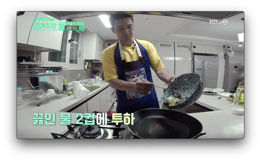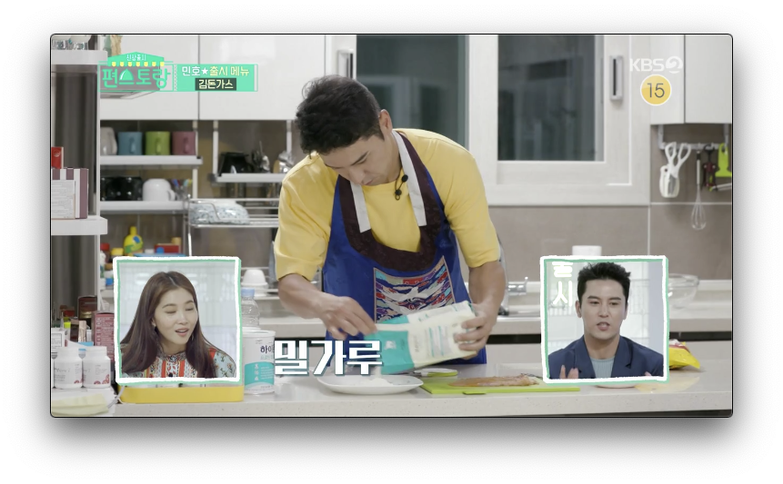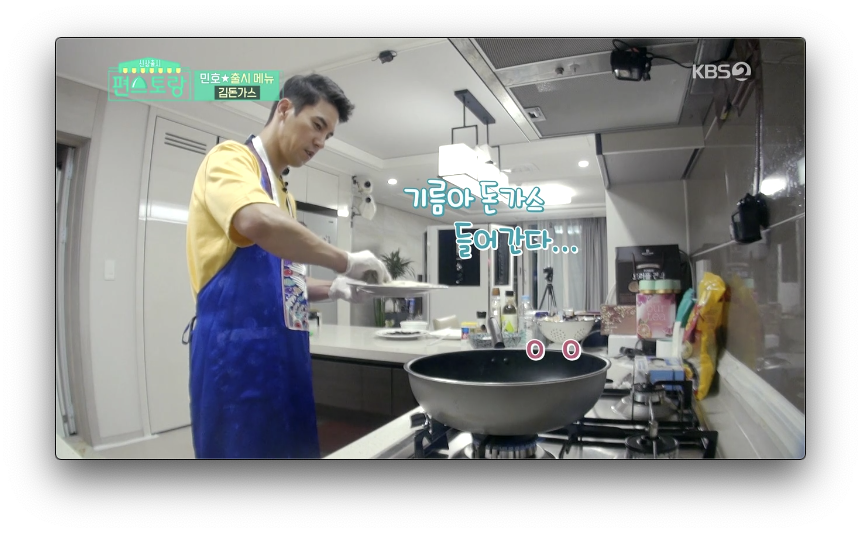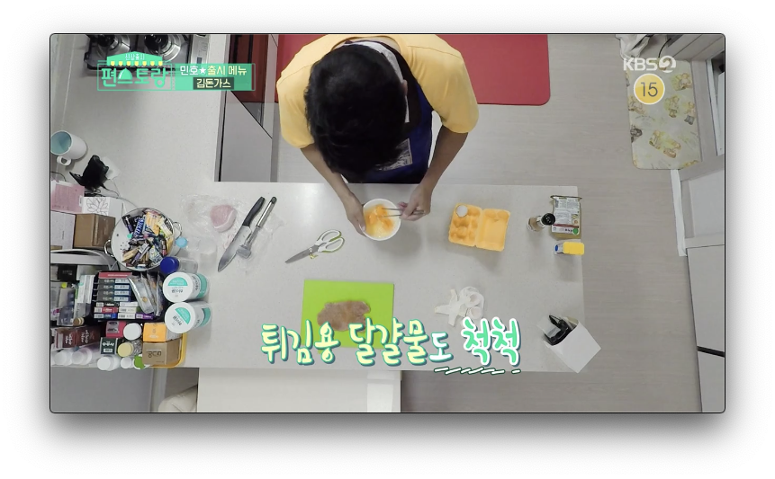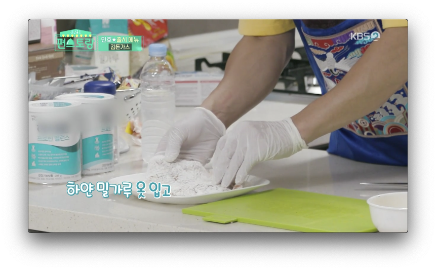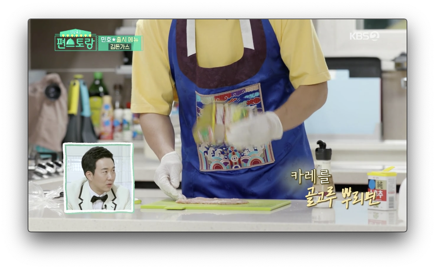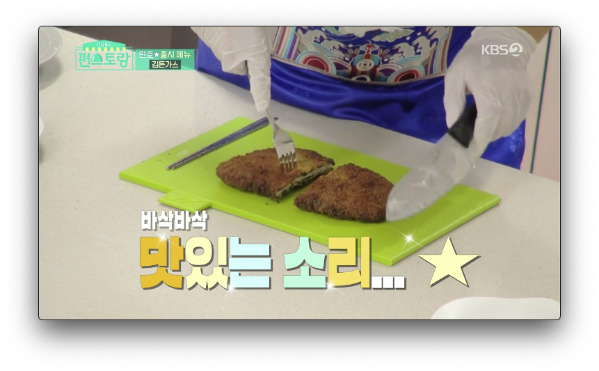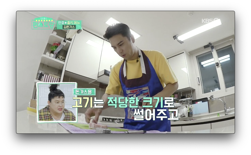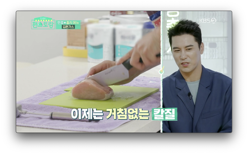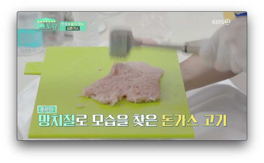 처음 시작할때는 칼질이 어려워 했던 장민호님이 이제는 거침없는 칼질을 보여주십니다. 돈까스 부위는 등심이나 안심을 사용하시면 됩니다.
