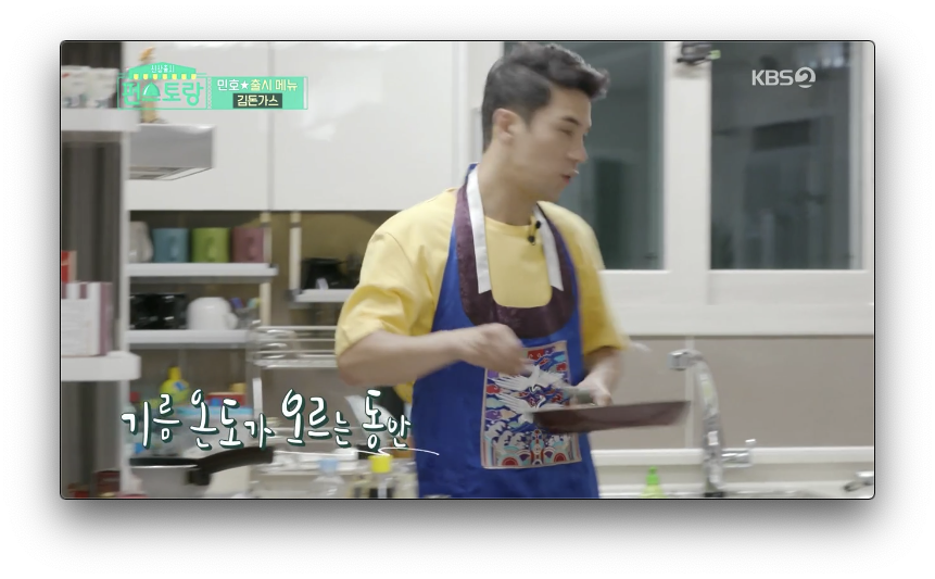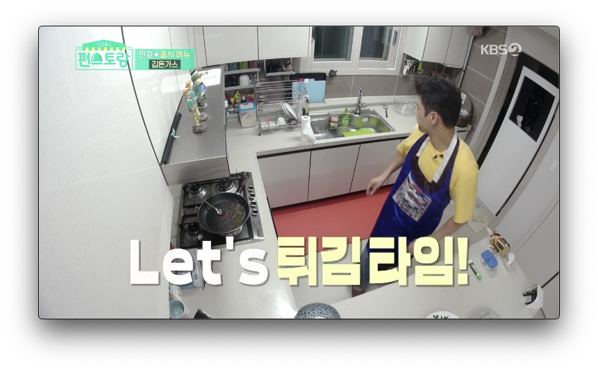 기름 온도가 올라갈 동안 정리정돈과 설거지를 하는 모습이 대단합니다.