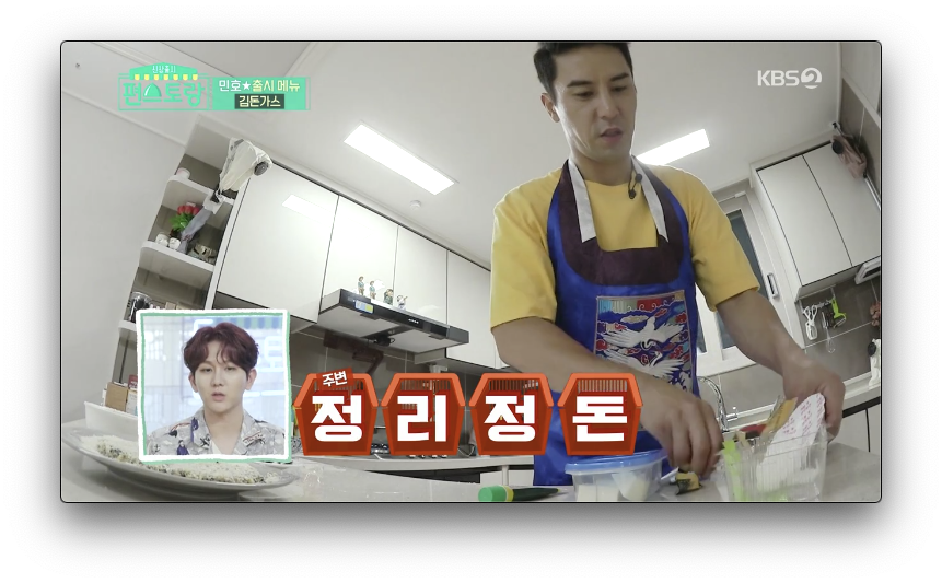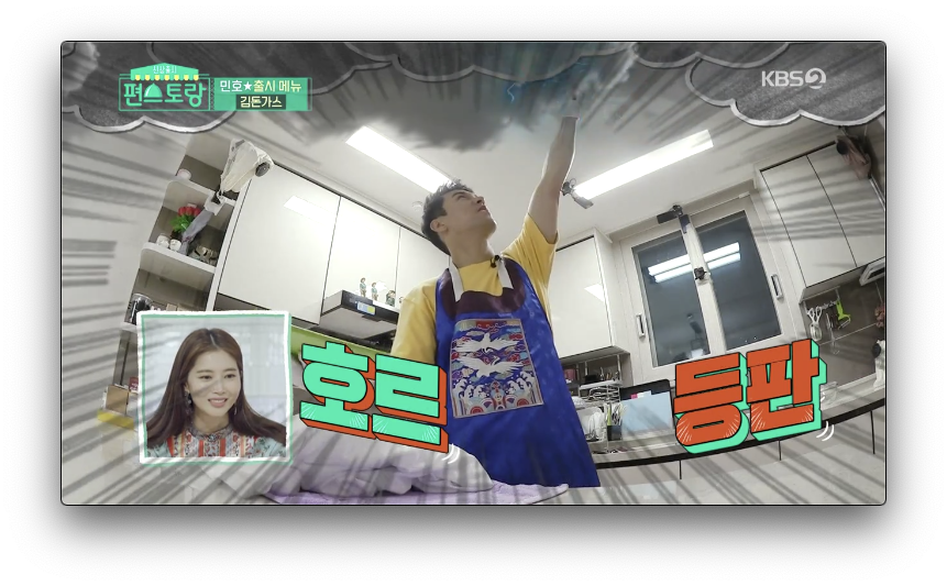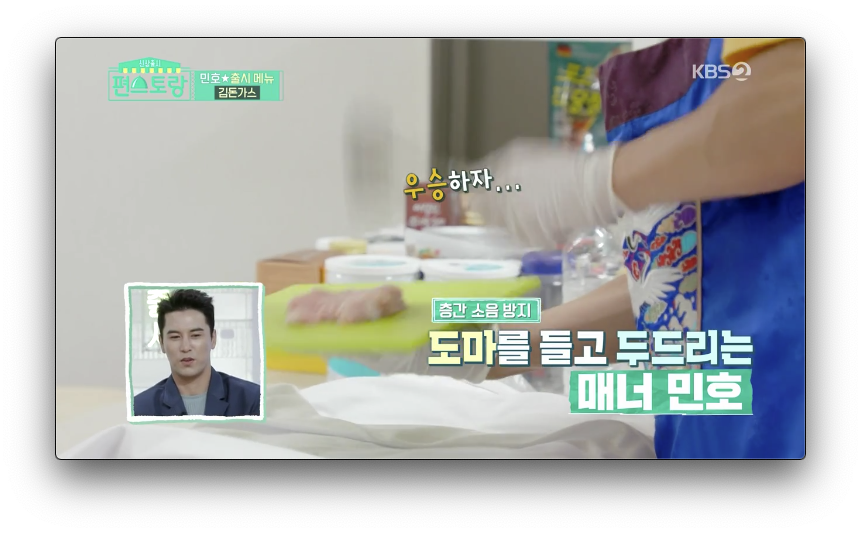 아파트는 역시 층간 소음 방지를 위해서 노력을 해야 합니다. 그래서 장민호님은 층간 소음 방지를 위해 도마를 들고 두드리는 모습을 보여줍니다.