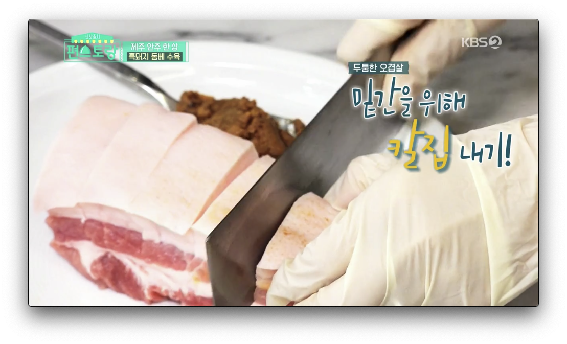 두툼한 통 오겹살을 밑간을 위해 칼집을 내주세요