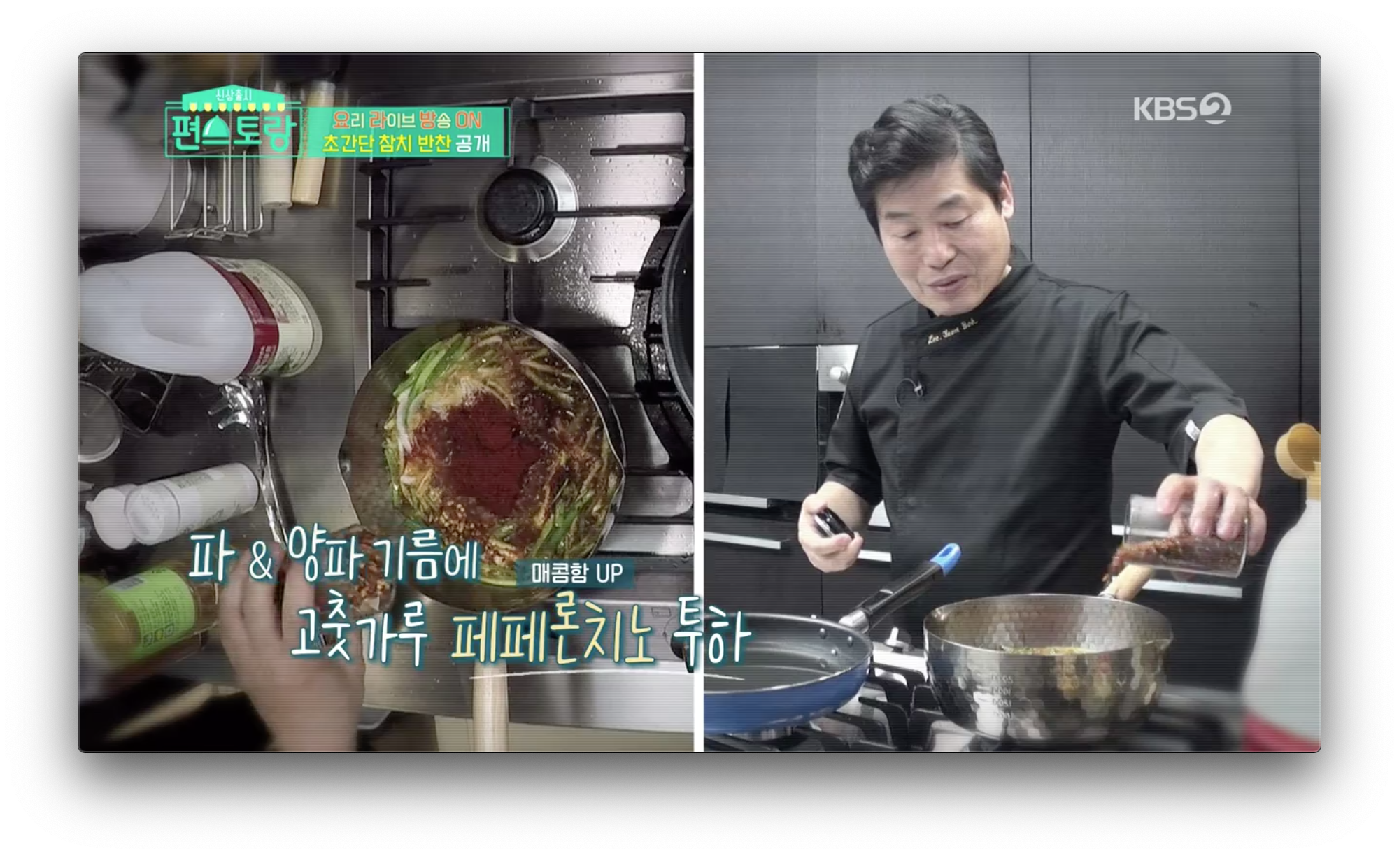 파 & 양파 기름에 고춧가루 와 페페론치노 투하!