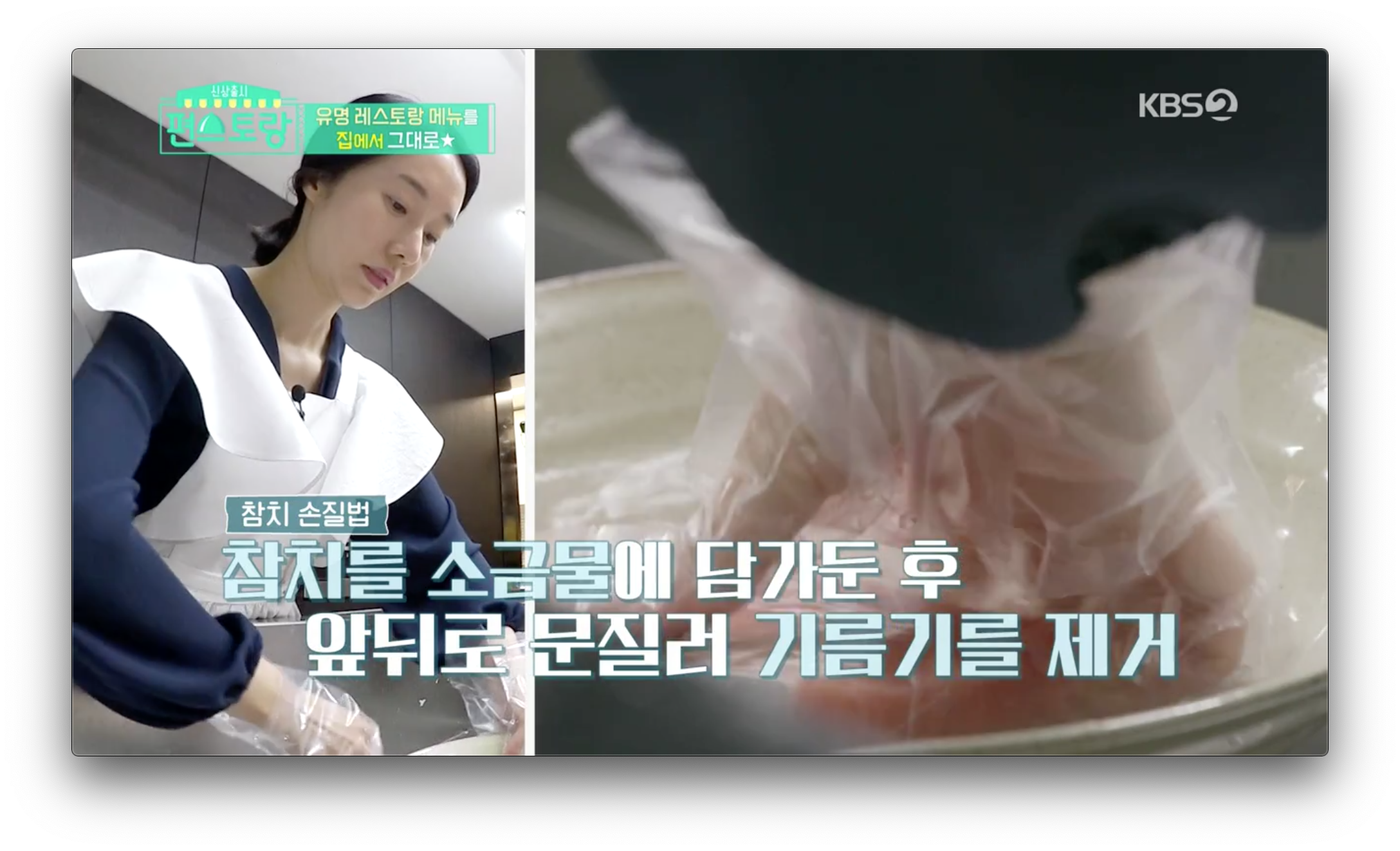 참치를 소금물에 담가둔 후 앞뒤로 문질러 기름기를 제거해주세요