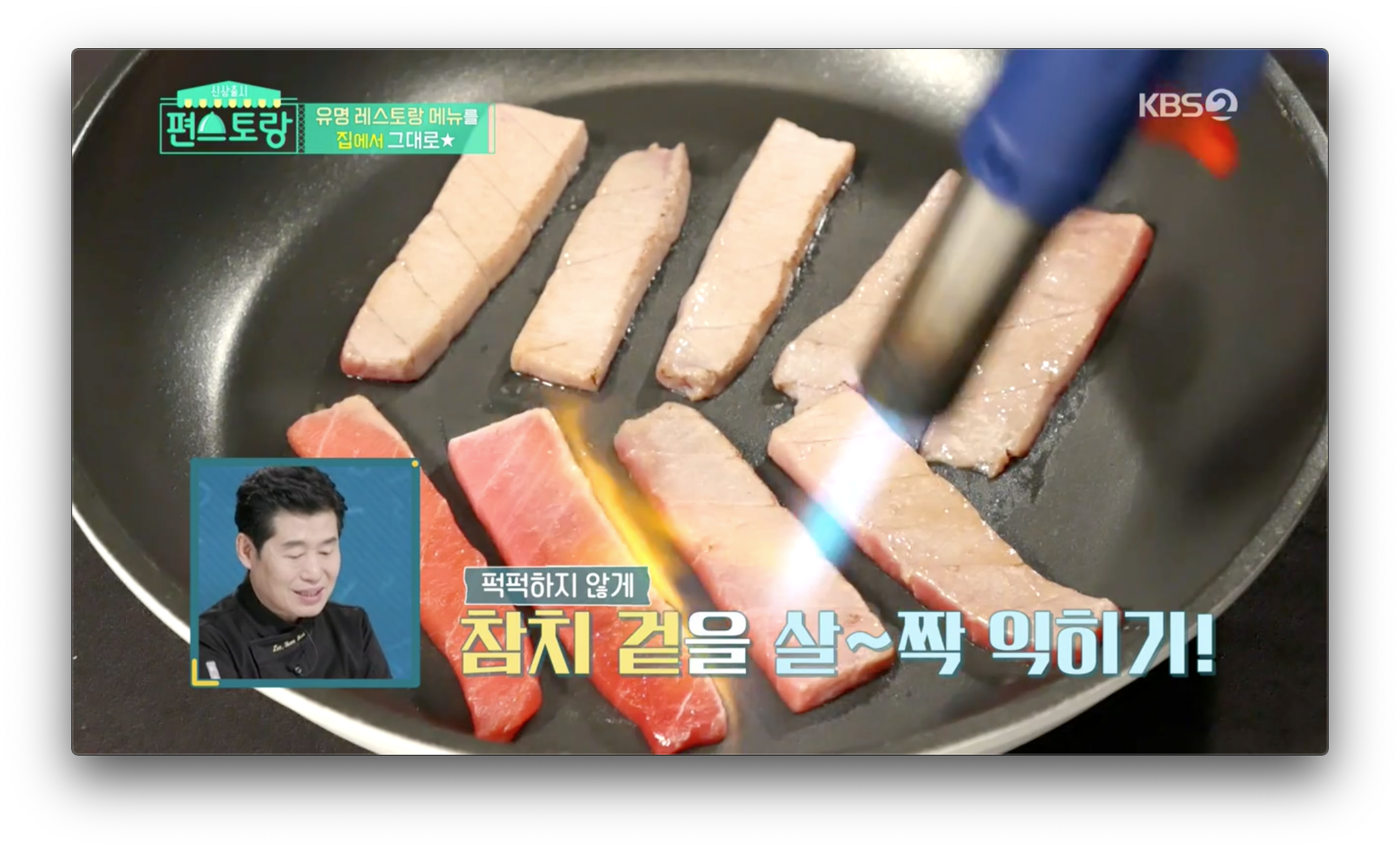 후라이팬에 양념한 참치를 올린뒤에 토치를 이용해서 겉만 살짝 익혀주세요