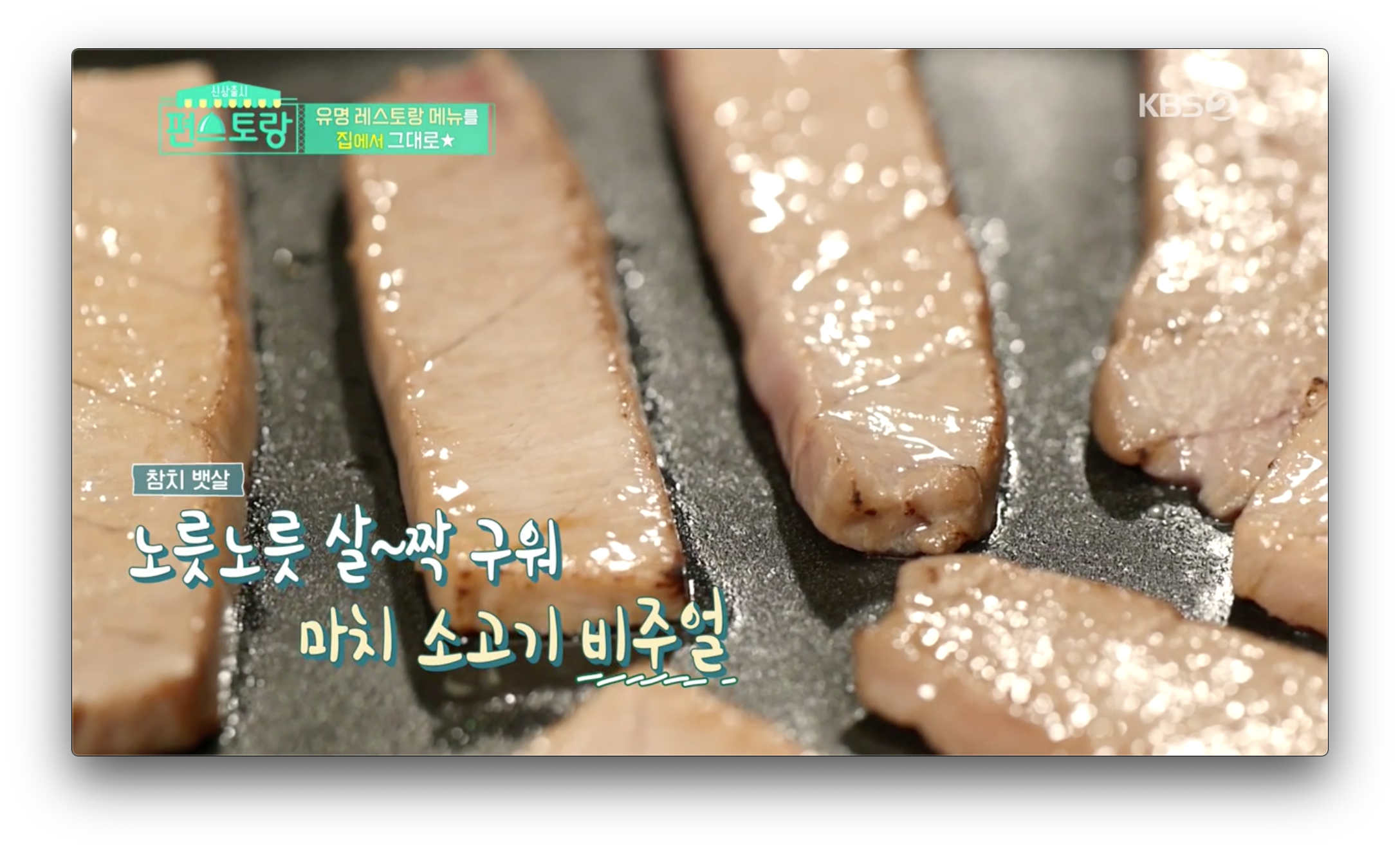 노릇노릇 살짝 구워진 참치는 마치 소고기 비주얼을 보여주는데요