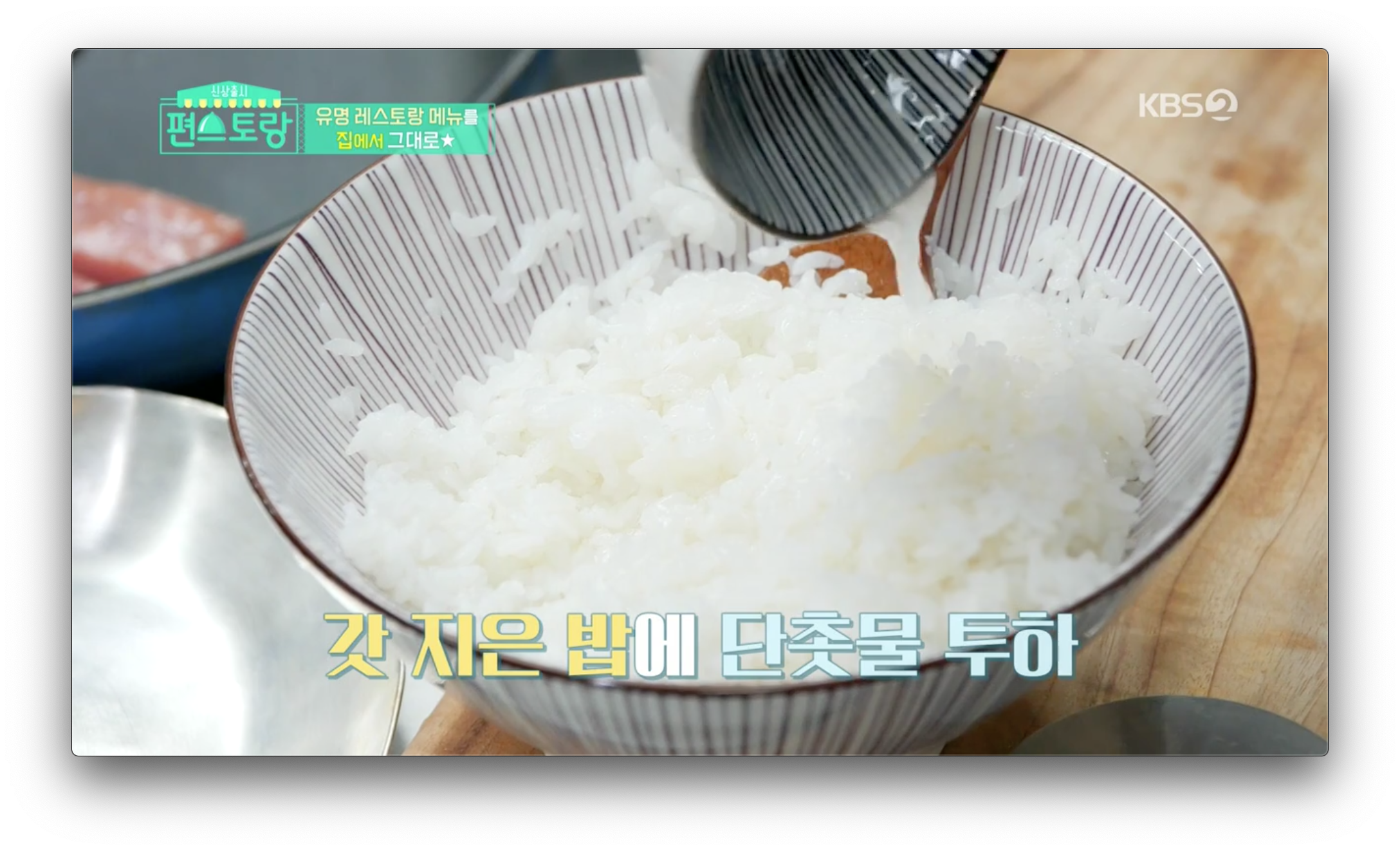 갓 지은 밥에 단촛물 투하 그리고 섞어주세요