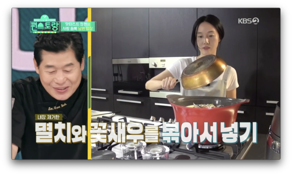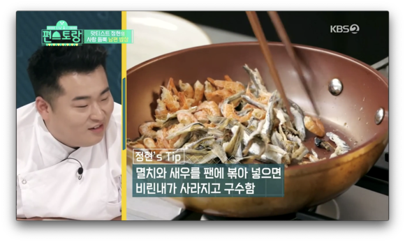 한쪽에서는 몇치와 새우를 팬에 볶아서 비린내가 사라지고 구수한 맛을 주기위해 볶아서 넣어주세요