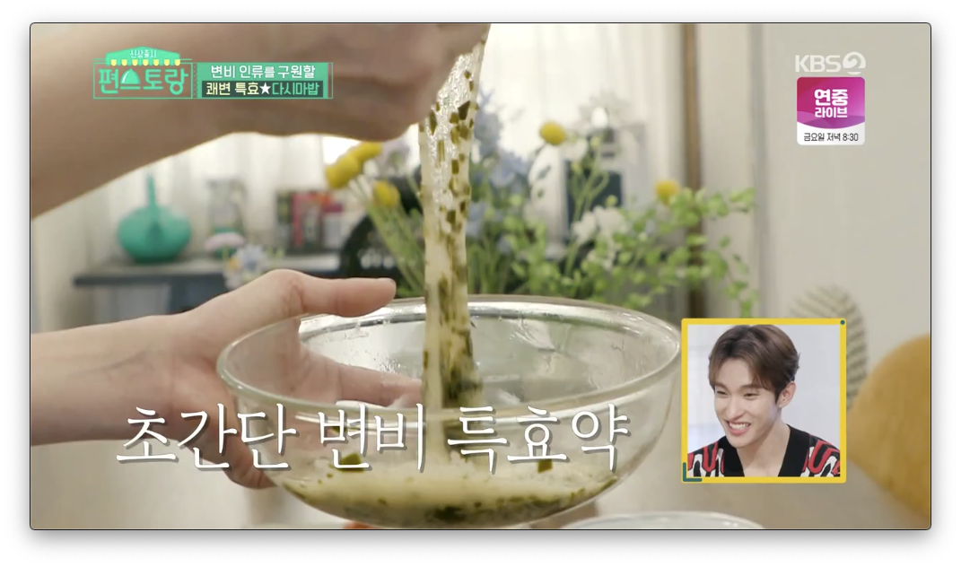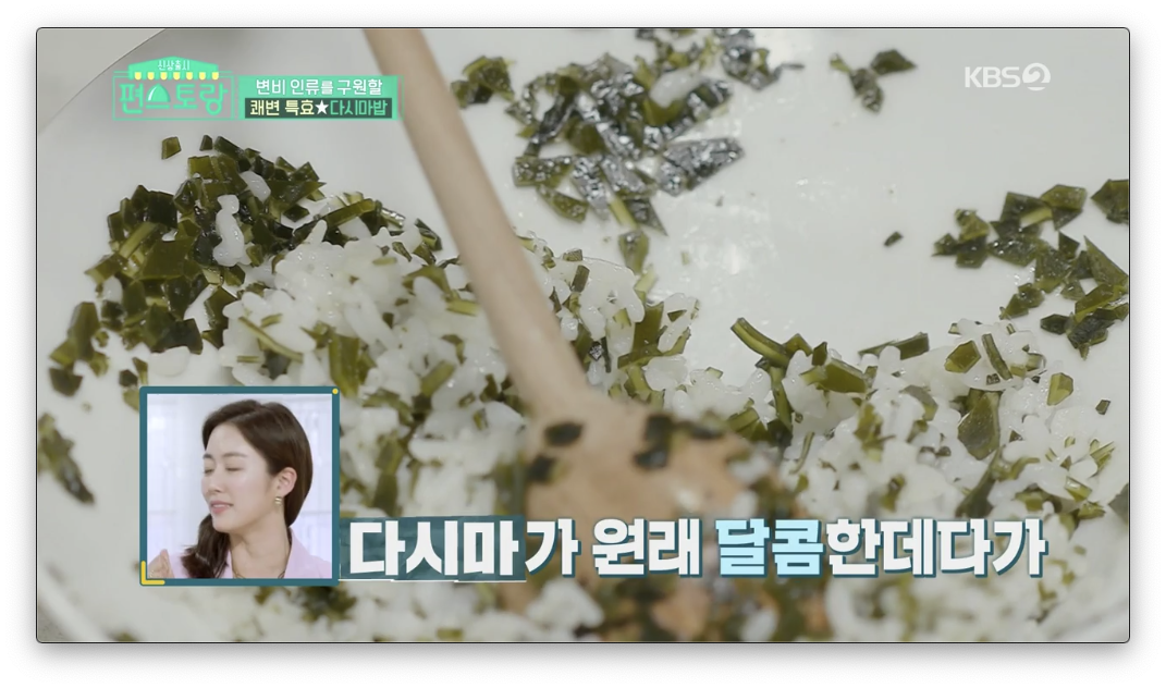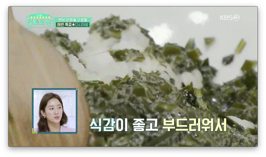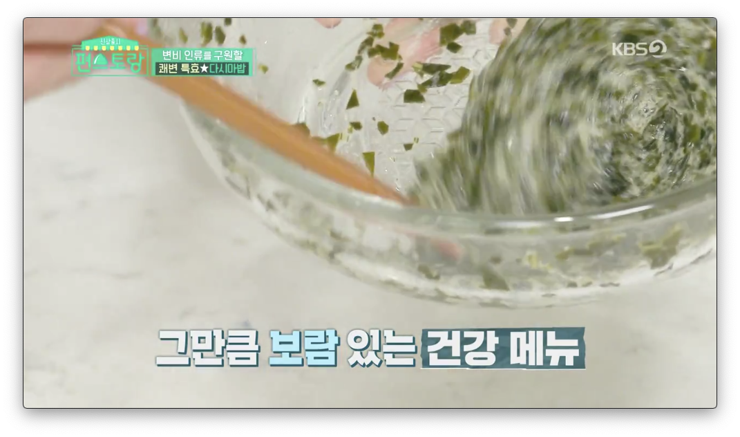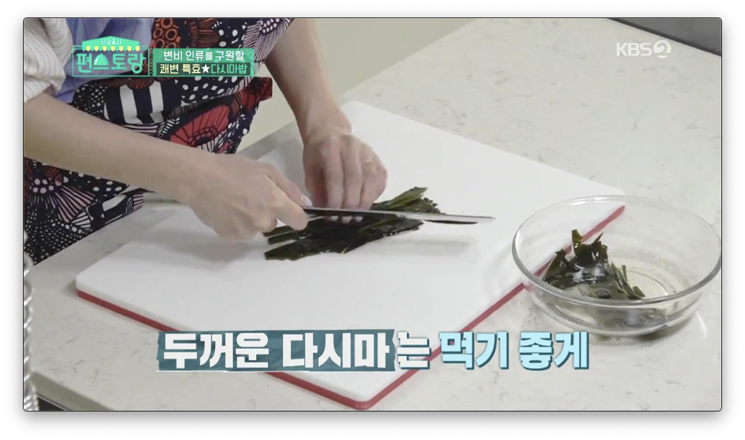 편스토랑에서 전혜빈님이 변비, 이제는 진짜 안녕이라는 다시마밥을 소개 했습니다. 수천만 변비 인구를 구원할 맛도 좋은 초간단 변비 특효약인 다시마 밥!!! 조리과정을 같이 보겠습니다.