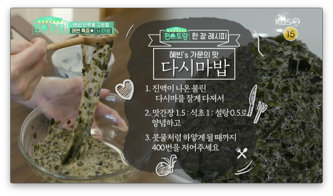 편스토랑의 다시마밥 한 장 레시피는요 1. 진액이 나온 불린 다시마를 잘게 다져서 2. 맛간장 1.5 : 식초 1 : 설탕 0.5로 양념하고 3. 콧물처렁 하얗게 될 때까지 400번을 저주세요 그러면 완성입니다.