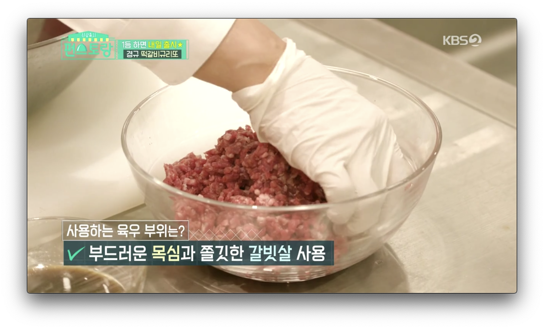 부리또 규리또에 들어가는 육우부위는 부드거운 목심과 쫄깃한 갈빗살을 사용한다고 합니다. 갈빗살은 여성분들이 등심보다 좋아한다고 합니다.