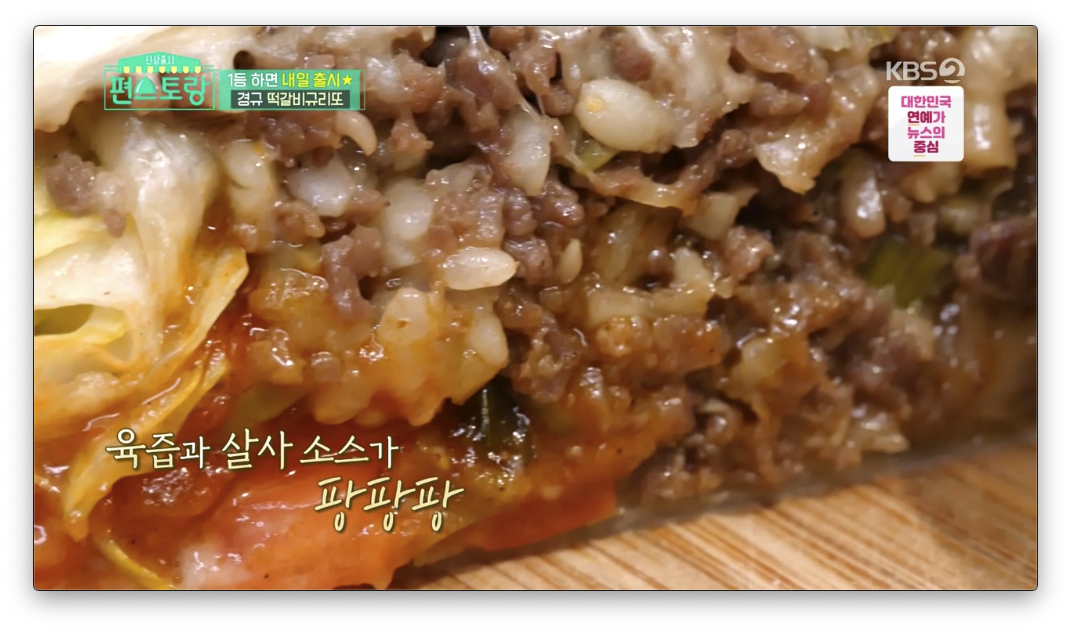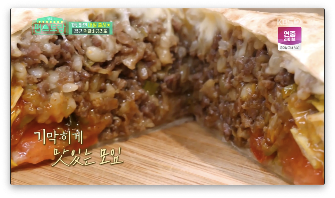 편스토랑에서 떡갈비규리또가 우승을 했어요 그래서 이번에는 떡갈비부리토 만드는 과정을 같이 확인 해볼려고해요 다만 유통되고 있는 규리또는 개인적으로 간이 너무 심심해요 조금더 간을 하거나 소스를 넉넉하게 사용해야 된다고 생각이 되요 푸짐하긴 푸짐합니다.