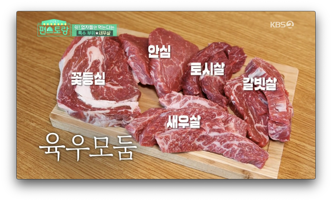 꽃등심 윗등심과 아랫등심 사이에 위차한 부위 그리고 발짝 구워 먹으면 꿀맛인 떡심도 소개했습니다.